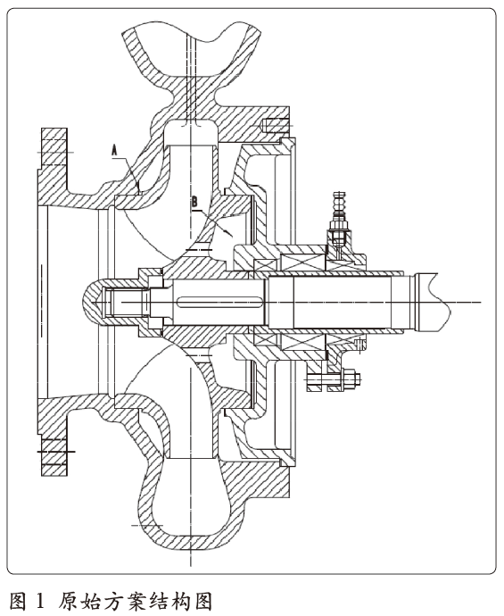 前期選型泵為閉式葉輪,葉輪前后蓋板與泵體、泵蓋形成的腔體,介質(zhì)顆粒物于前泵腔A 處堆積,形成“砂輪磨損”效應(yīng),致使泵體口環(huán)處及泵體前腔壁磨損;介質(zhì)通過葉輪平衡孔進(jìn)入后泵腔在B 處堆積,同樣致使泵蓋產(chǎn)生磨損。原機(jī)械密封采用雙端面多彈簧結(jié)構(gòu)的非平衡型機(jī)封,介質(zhì)可以通過機(jī)封腔進(jìn)入彈簧元件,致使其卡頓失效。