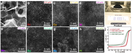 實驗中,只需將葡萄糖溶液與多孔碳載體及金屬鹽前體混合,再與三聚氰胺一起熱處理即可獲得高密度、穩(wěn)定的單原子分散的M-Nx催化劑。該策略對多種金屬、載體、絡合劑普遍適用;制備過程簡單,成本低,可規(guī)模化制備;催化劑性能優(yōu)異。例如,Fe-Nx催化劑堿性氧還原半波電位可達0.90 V,在此電位下動力學質(zhì)量活性可達100.7 A/g,明顯優(yōu)于商業(yè)20 wt% Pt/C催化劑;Ni-Nx催化劑電催化還原CO2時在30 mA/cm2的電流密度下法拉弟效率也可達89%。這一逐級錨定新策略為宏量制備高密度、高活性、高穩(wěn)定性的單原子分散M-Nx類催化劑提供了一種新的普適的方法 Nat. Commun. 2019, 10, 1278 。