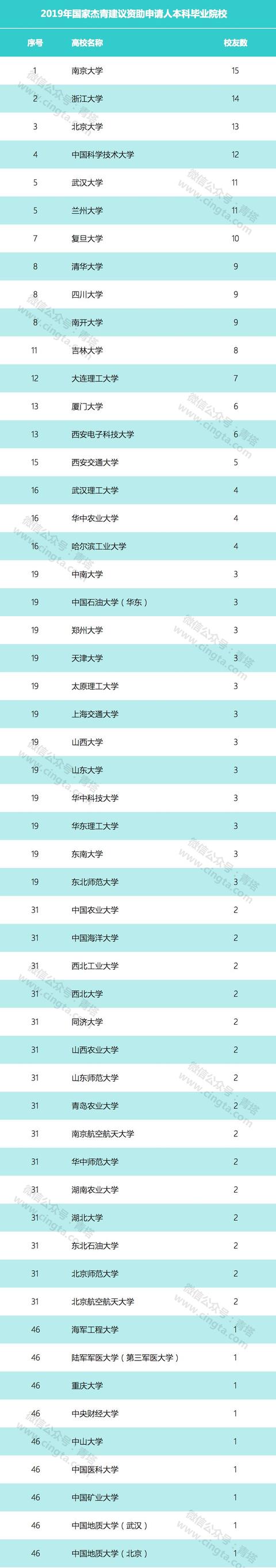 統(tǒng)計(jì)結(jié)果顯示,300位2019年國家杰青建議資助人選中,本科畢業(yè)于南京大學(xué)最多,高達(dá)15人,位居高校第一。本科畢業(yè)于浙江大學(xué)的杰青建議資助人緊隨其后,共14人,位居第二。本科畢業(yè)于北京大學(xué)的杰青建議資助人人共有13人,位居第三。畢業(yè)于中國科學(xué)技術(shù)大學(xué)的共有12人,位居第四。武漢大學(xué)和蘭州大學(xué)各有11人,并列第五。清華大學(xué)、四川大學(xué)和南開大學(xué)各有9人,并列第八位。吉林大學(xué)、大連理工大學(xué)、廈門大學(xué)、西安電子科技大學(xué)、西安交通大學(xué)等也有5人或5人以上。這些數(shù)據(jù)也表明這些高校在高端人才培養(yǎng)方面具有一定領(lǐng)先優(yōu)勢。