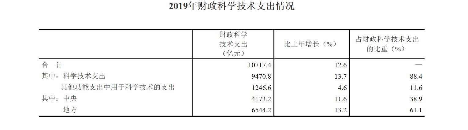 從財(cái)政科學(xué)技術(shù)支出情來(lái)看,我國(guó)財(cái)政科技支出持續(xù)增加,經(jīng)費(fèi)投入突破萬(wàn)億。2019年,國(guó)家財(cái)政科學(xué)技術(shù)支出10717.4億元,比上年增加1199.2億元,增長(zhǎng)12.6%。其中,中央財(cái)政科學(xué)技術(shù)支出4173.2億元,增長(zhǎng)11.6%,占財(cái)政科學(xué)技術(shù)支出的比重為38.9%;地方財(cái)政科學(xué)技術(shù)支出6544.2億元,增長(zhǎng)13.2%,占比為61.1%。
