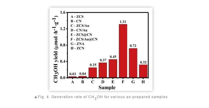 圖4顯示了已制備樣品在可見(jiàn)光照射下(1h)的光催化生成甲醇情況。純ZCS和CN的光催化活性較低,這可能是由于光生載流子的快速重組所致。而所有復(fù)合樣品都比原始ZCS和CN具有更高的光催化活性。全固態(tài)ZCS/Au@CN催化劑Z使得光催化還原CO2的最大產(chǎn)甲醇量為1.31 μmolh?1g?1,比ZCS (0.03 μmolh?1g?1)和CN (0.04 μmolh?1g?1)樣品分別提高了43.6倍和32.7倍。結(jié)果表明,ZCS和CN光催化劑的負(fù)載AuNPs快速促進(jìn)了載流子的分離,提高了光催化CO2還原活性。此外,物理混合催化劑(ZCN和 ZNA)的光催化CO2還原活性遠(yuǎn)低于ZCS/Au@CN催化劑,說(shuō)明三組分之間的化學(xué)鍵合對(duì)提高CO2還原中的光催化活性至關(guān)重要。