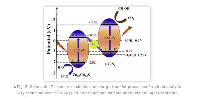 如圖6所示,ZCS和CN的導(dǎo)帶(CB)是-0.35和-1.52 eV,比標(biāo)準(zhǔn)的CO2/ CH3OH氧化還原電勢(shì)更負(fù),而ZCS和CN的價(jià)帶(VB)是2.02和0.99 eV,比標(biāo)準(zhǔn)的O2 / H2O氧化還原電勢(shì)更正。因此,從熱力學(xué)角度看,在可見(jiàn)光照射下,ZCS和CN都能光激發(fā)并將CO2還原為CH3OH或CH4。然而,如圖4所示,ZCS和CN在光照1h后都不能產(chǎn)生足夠的CH3OH。這一事實(shí)表明,在純ZCS和CN中,光致電子的有效收集和分離是不可行的。具體而言,三元體系中光催化CO2減排增強(qiáng)活性可能有兩種機(jī)制:(1)傳統(tǒng)II型異質(zhì)結(jié)和(2)直接Z-Scheme。在第一類普通電荷轉(zhuǎn)移體系中,光子輻照后,CN的CB中的光激發(fā)電子遷移到ZCS的CB中,ZCS的VB中的空穴遷移到CN的VB中。在這個(gè)過(guò)程中,電子-空穴對(duì)是空間分離的。而ZCS的CB和CN的VB中積累的電子和空穴具有較低的還原氧化電位。因此,整體光催化劑的氧化還原能力大大降低。相比之下,在第二種體系中,兩種催化劑在開(kāi)放的可見(jiàn)光照射下都被光激發(fā)產(chǎn)生電子和空穴。ZCS、Au、CN界面在光照射前形成了費(fèi)米能級(jí)平衡,ZCS的CB上的電子在光照射后迅速遷移到AuNPs。因此,CN的CB中積累的勢(shì)能高的電子可以還原CO2生成CH3OH,而ZCS的VB中留下的空穴可以實(shí)現(xiàn)光氧化過(guò)程生成H+和O2自由基。值得注意的是,這種類型的電荷轉(zhuǎn)移途徑保留了ZCS更正的VB上的光生空穴和CN更負(fù)的CB上的電子,這可能不僅顯著增強(qiáng)了載流子的分離,而且抑制了載流子的重組。從能帶結(jié)構(gòu)分析、ESR結(jié)果、CO2還原活性的增強(qiáng)、分離效率的提高以及氧化還原能力的增強(qiáng)來(lái)看,ZCS與CN光催化劑之間形成直接Z-Scheme機(jī)制比形成傳統(tǒng)II型異質(zhì)結(jié)更有利。