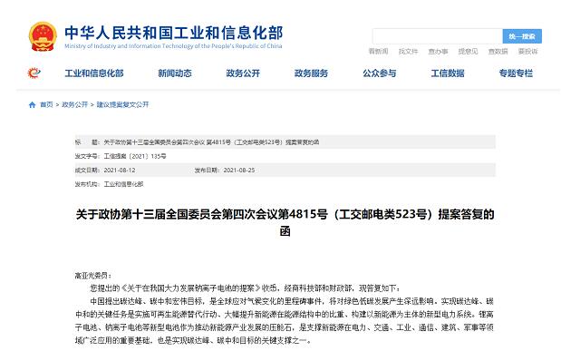 8月25日,工信部發(fā)布《關(guān)于政協(xié)第十三屆全國(guó)委員會(huì)第四次會(huì)議 第4815號(hào)(工交郵電類523號(hào))提案答復(fù)的函》,針對(duì)《關(guān)于在我國(guó)大力發(fā)展鈉電池的提案》做出了回復(fù)。其中提到,鋰離子電池、鈉電池等新型電池作為推動(dòng)新能源產(chǎn)業(yè)發(fā)展的壓艙石,是支撐新能源在電力、交通、工業(yè)、通信、建筑、軍事等領(lǐng)域廣泛應(yīng)用的重要基礎(chǔ),也是實(shí)現(xiàn)碳達(dá)峰、碳中和目標(biāo)的關(guān)鍵支撐之一。 并表示將適時(shí)開(kāi)展鈉電池標(biāo)準(zhǔn)制定,引導(dǎo)產(chǎn)業(yè)高質(zhì)量發(fā)展。