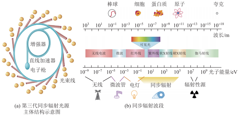 同步輻射是指速度接近光速的帶電粒子在做曲線運動時沿切線方向發(fā)射出的電磁輻射,它的光譜很寬,可以覆蓋從紅外、紫外、軟X射線到硬X射線的光譜范圍,為眾多基礎科學領域和應用研究提供先進手段。從此人類對世界的探索,在空間上拓展到原子與分子尺度,在時間上拓展到納秒、皮秒或飛秒尺度。通過同步輻射光源,我們能夠看到以前難以觀察的物質(zhì)內(nèi)部結(jié)構(gòu)以及變化過程。同步輻射光源是基于同步加速器的裝置,其主要組成部分包括:注入器、儲存環(huán)、光束線、實驗站。同步輻射光源被稱為高品質(zhì)的巨型X射線機和超級顯微鏡,具有高亮度、高準直性以及波長可調(diào)等不可替代的優(yōu)點,是支撐眾多學科前沿基礎研究與高新技術(shù)研發(fā)不可或缺的實驗平臺(圖2)。