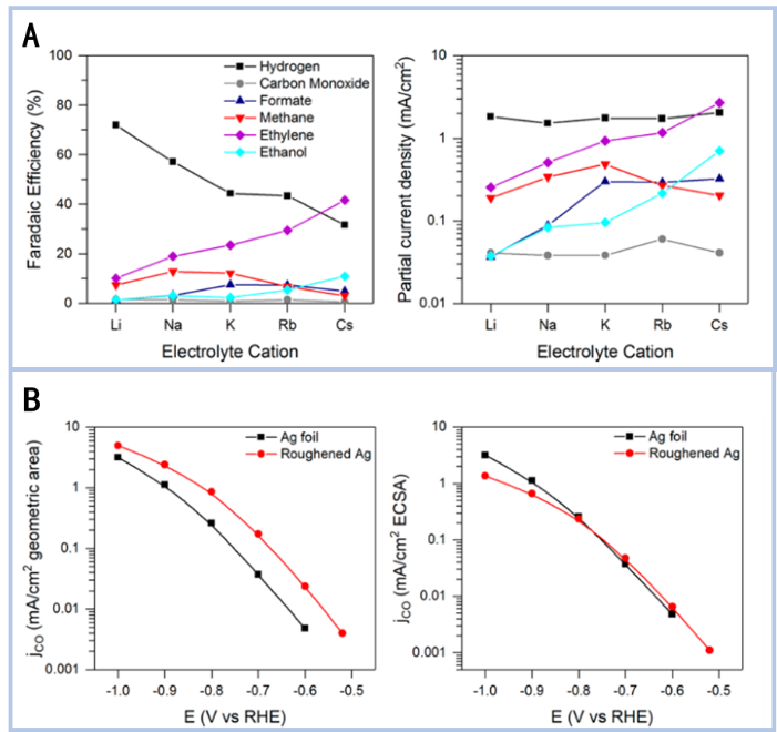 圖3.(A) Cu(100)上產(chǎn)物法拉第效率和部分電流密度對電解液陽離子的函數(shù),-1.0V vs RHE,重碳酸鹽電解液;(B) 機(jī)械拋光和電化學(xué)粗糙的銀催化劑上的活性,左為幾何面積右為電化學(xué)活性表面積(ECSA).