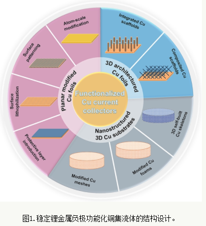(1)銅箔的平面化改性:主要涉及銅箔的原子級(jí)改性、圖案化設(shè)計(jì)、親鋰性位點(diǎn)修飾以及界面保護(hù)層構(gòu)筑,調(diào)控集流體本征性質(zhì)和表面電場(chǎng)/離子場(chǎng)分布,誘導(dǎo)鋰金屬均勻形核和沉積。
