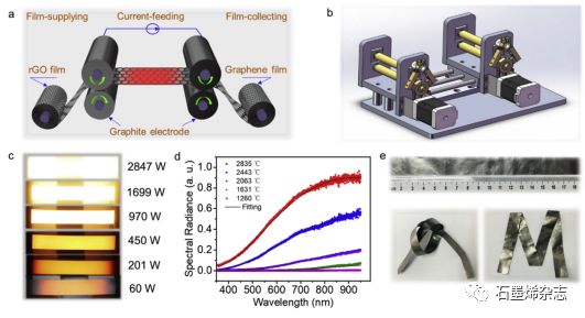 Figure 1. (a)連續(xù)電熱示意圖,(b)連續(xù)電熱裝置,(c)石墨烯膜電熱過程中的照片,(d)不同溫度的光譜圖,(e)所制備的柔性石墨烯導熱膜。