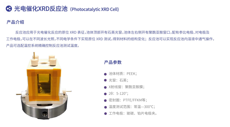光電催化xrd反應(yīng)池應(yīng)用于光電催化反應(yīng)的原位 XRD 表征,池體頂部開有石英光窗,池體左右側(cè)開有聚膚亞胺窗口,配有參比電極、對(duì)電極及工作電極,可以在不同該長光照,不同電學(xué)條件下實(shí)現(xiàn)原位 XRD測(cè)試,得到材料的結(jié)構(gòu)變化;反應(yīng)池可以實(shí)現(xiàn)反應(yīng)池內(nèi)溶液中通氣操作,產(chǎn)品可選溫控系統(tǒng)精確控制反應(yīng)池測(cè)試溫度。