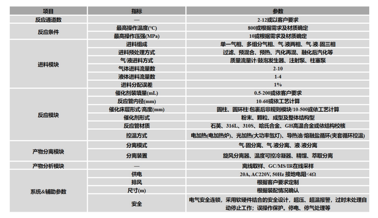 本裝置配置三路氣體進料和一路液體進料,包括但不限于C02加氫制備甲醇、丙酮縮合-加氫制備甲基異丁基酮等反應(yīng).可實現(xiàn)遠程控制、尾氣物流分流和全組分進樣分析.