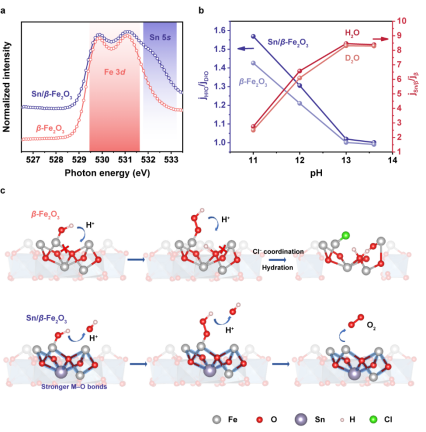 論文中提出了晶格中的Sn增強(qiáng)金屬-氧相互作用的原理,Sn的存在顯著增強(qiáng)了M-O鍵的強(qiáng)度,防止反應(yīng)中間體局部高濃度的質(zhì)子對晶格的攻擊,提高了晶體結(jié)構(gòu)的穩(wěn)定性。制備的Sn/β-Fe2O3光陽極在長時(shí)間反應(yīng)后僅在淺層表面檢測到重構(gòu)的發(fā)生和Cl?的吸附。在模擬海水電解液中工作3000小時(shí)后,光電流仍然保持在初始值的96.8%,是目前世界上穩(wěn)定性最高的光陽極材料。此外,該工作對材料在海水中腐蝕機(jī)理的探究,以及在防腐蝕領(lǐng)域的探索也具有重要意義。