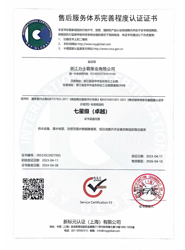 七星級(jí)(卓越)售后服務(wù)體系完善程度認(rèn)證證書